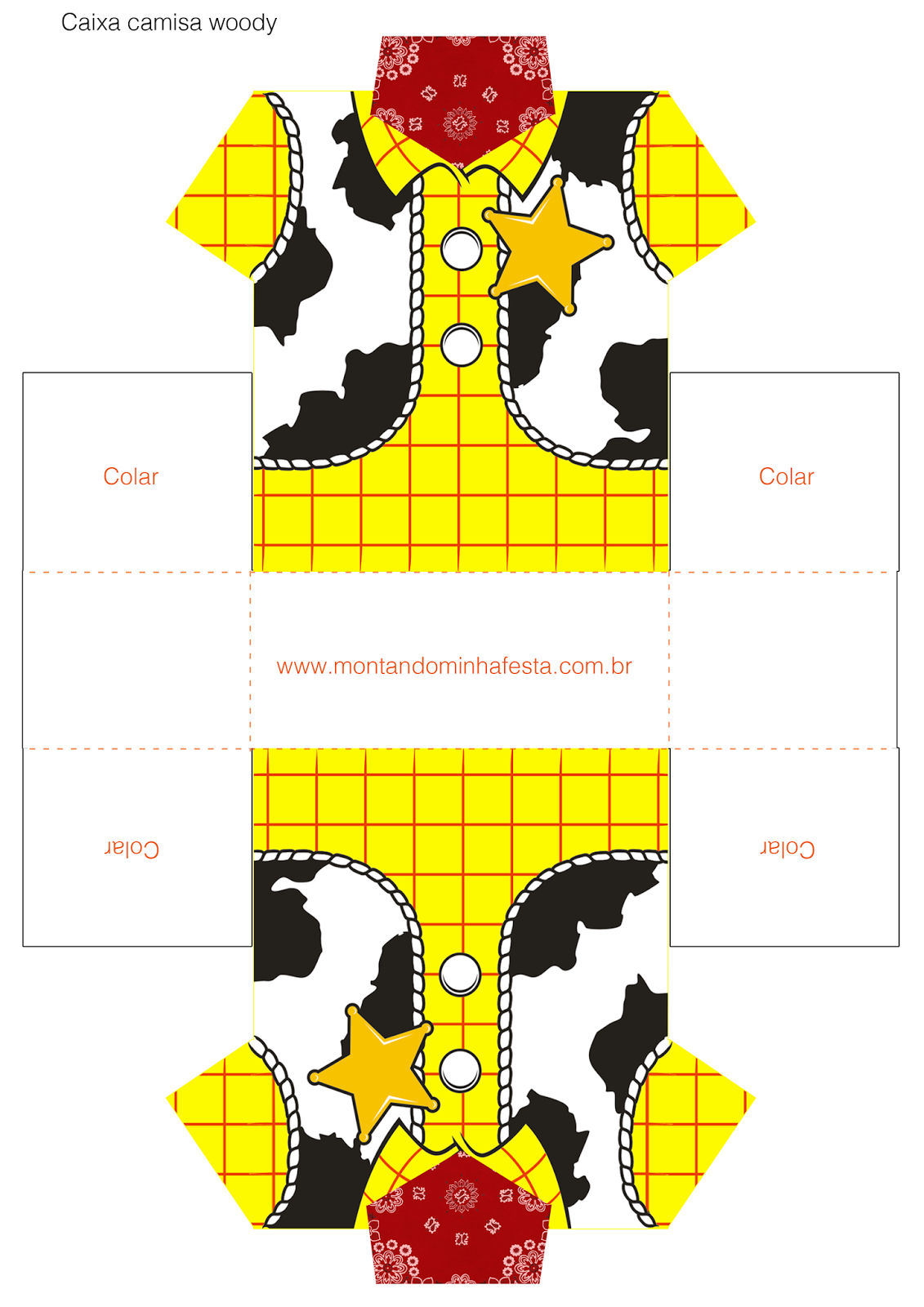 A caixa ou sacola camisa do Woody é uma linda opção de lembrancinha que também pode ser usada na decoração da mesa do bolo.Você pode imprimir no tamanho A4 ou maior.O papel para impressão pode ser o fotográfico para impressoras jato de tinta ou o couche para impressora laser.